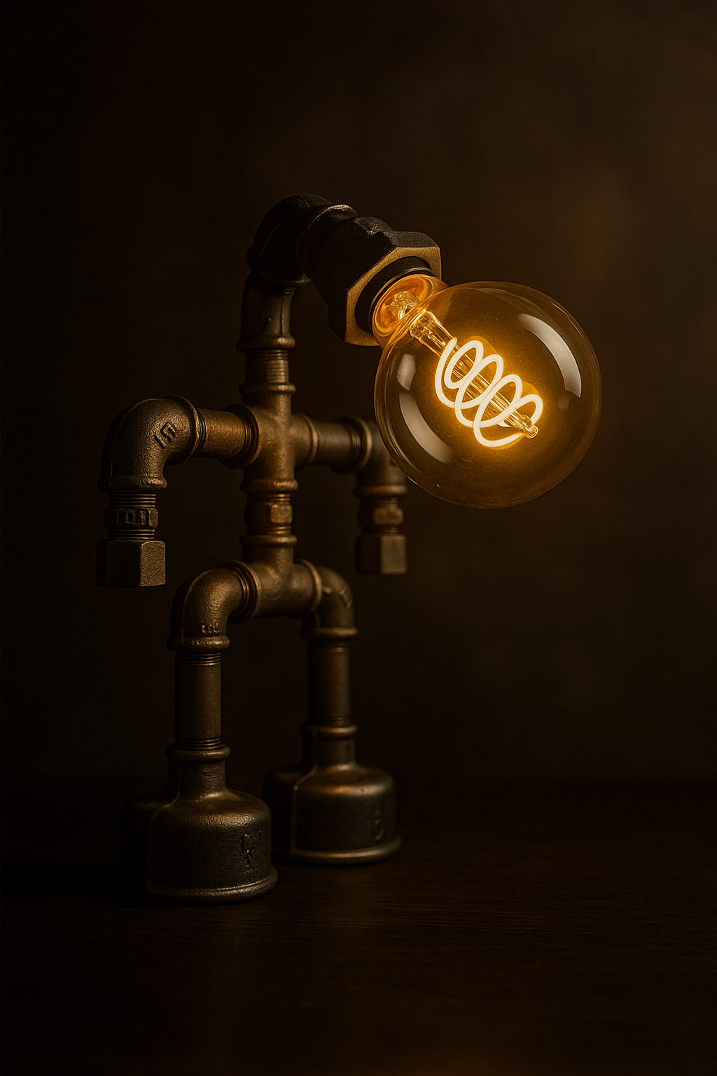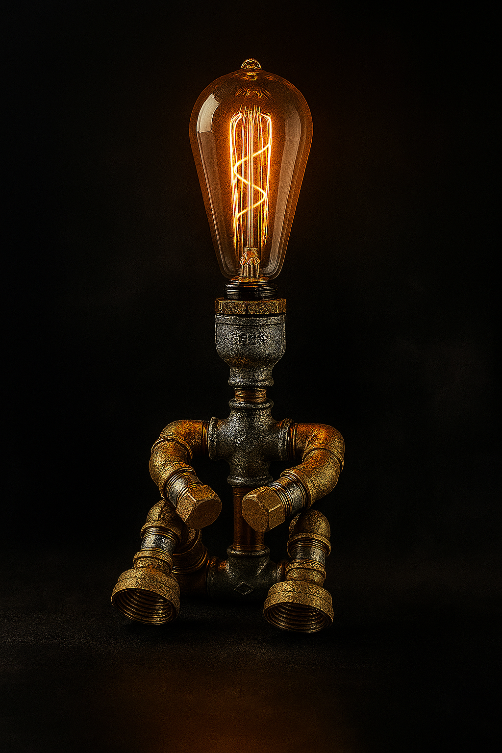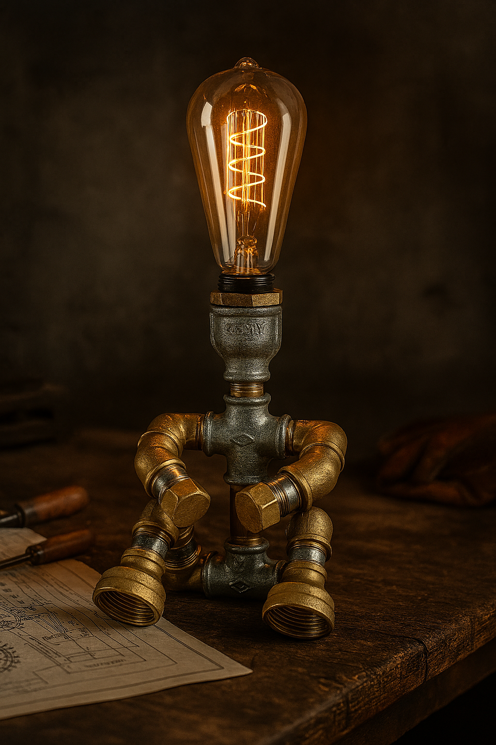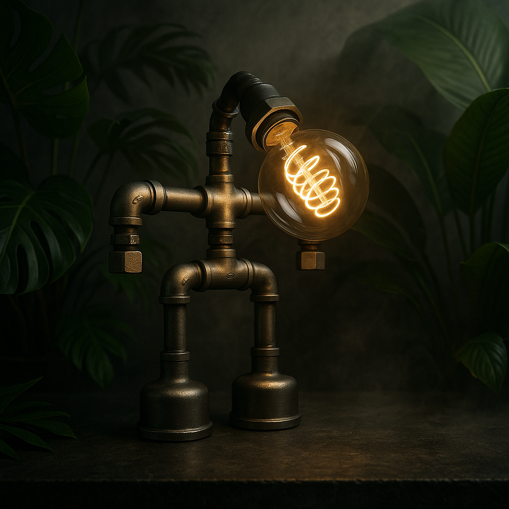 Deze industriële tafellamp is vervaardigd uit hoogwaardige messing en gegalvaniseerde stalen fittingen, zorgvuldig samengesteld tot een speels ontwerp. De robuuste materialen en warme metaaltonen geven de lamp een krachtige, authentieke uitstraling die perfect past bij industriële, loft- en retro-interieurs.