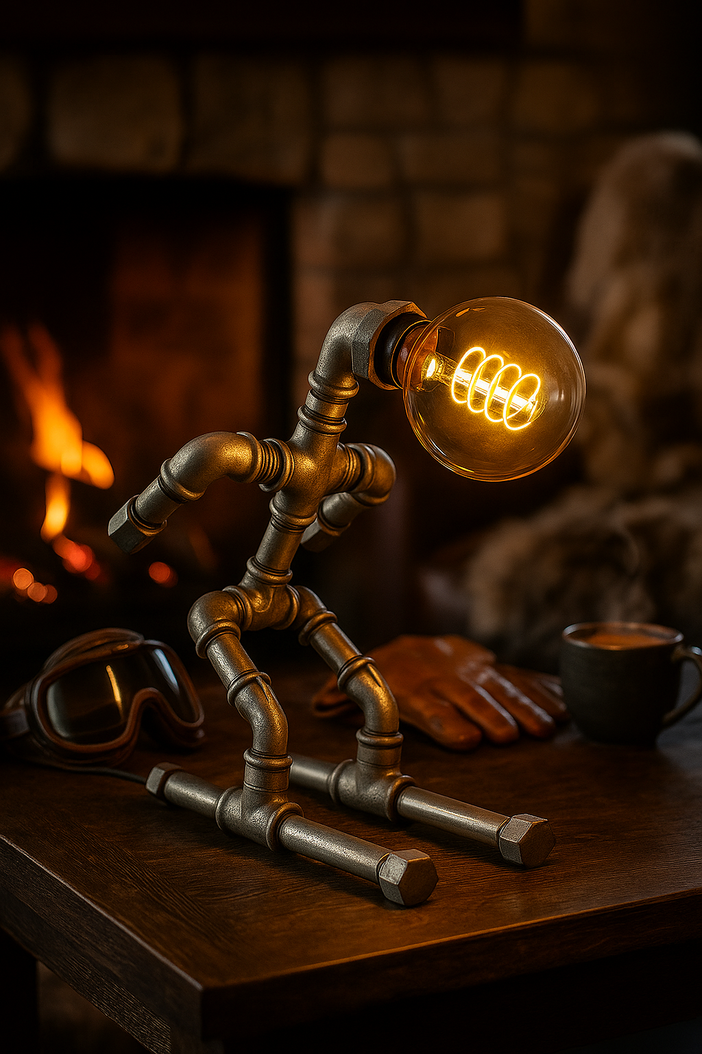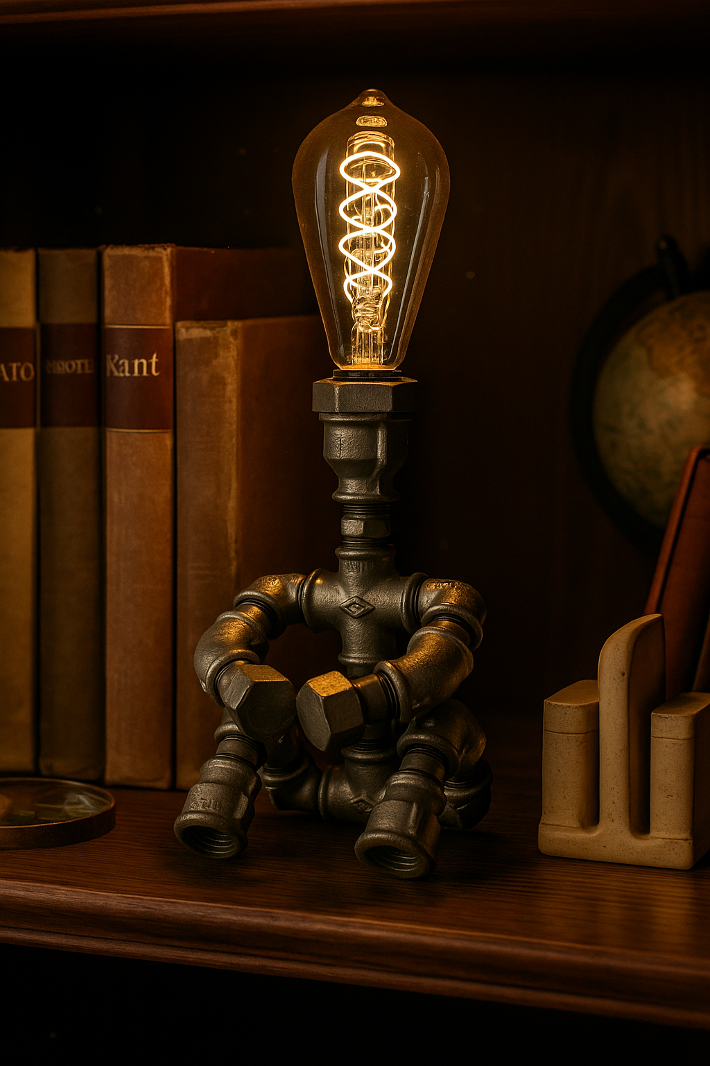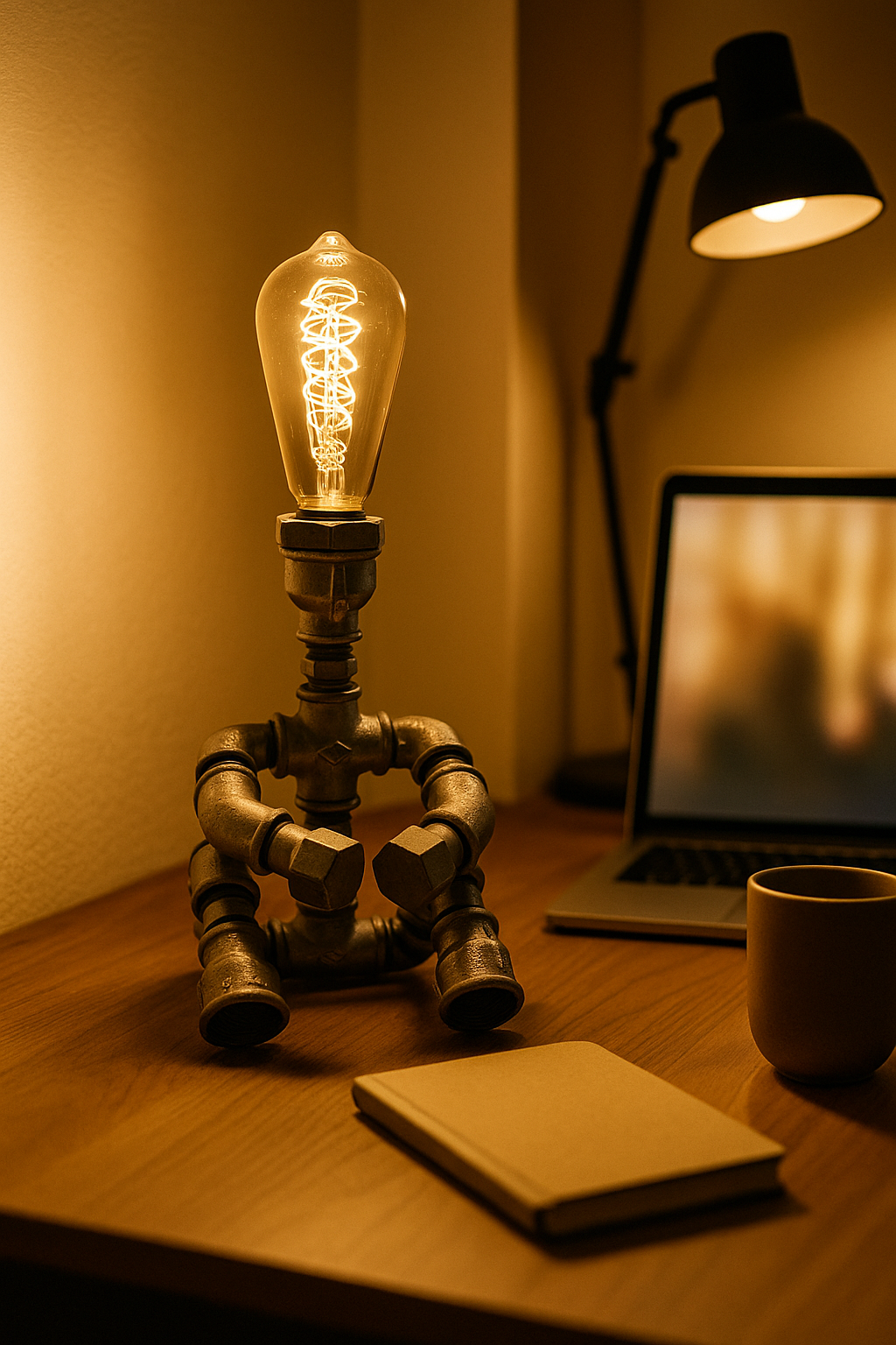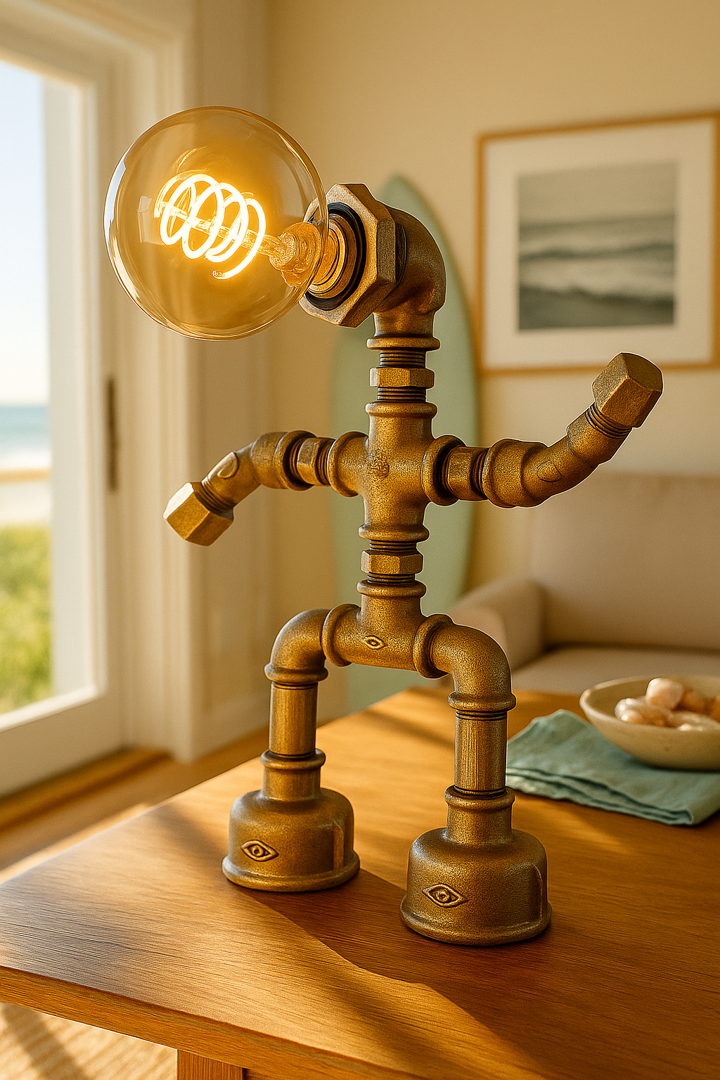 Deze industriële tafellamp is vervaardigd uit hoogwaardige messing en gegalvaniseerde stalen fittingen, zorgvuldig samengesteld tot een speels ontwerp. De robuuste materialen en warme metaaltonen geven de lamp een krachtige, authentieke uitstraling die perfect past bij industriële, loft- en retro-interieurs.